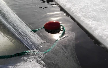 On the ice, we move with snowmobiles or snowdogs. A rectangular hole is made at the fishing spot, where the seine is lowered under the ice. Robots are placed on the outer edges of the seine and controlled through the ice in the right direction. The seine is pulled about 500 meters under the ice and lifted on the ice using manual strength. Air bubbles are used to prevent the vendaces from escaping the seine. The catch can sometimes be just a few kilograms, or it can be well over 1000 kg.